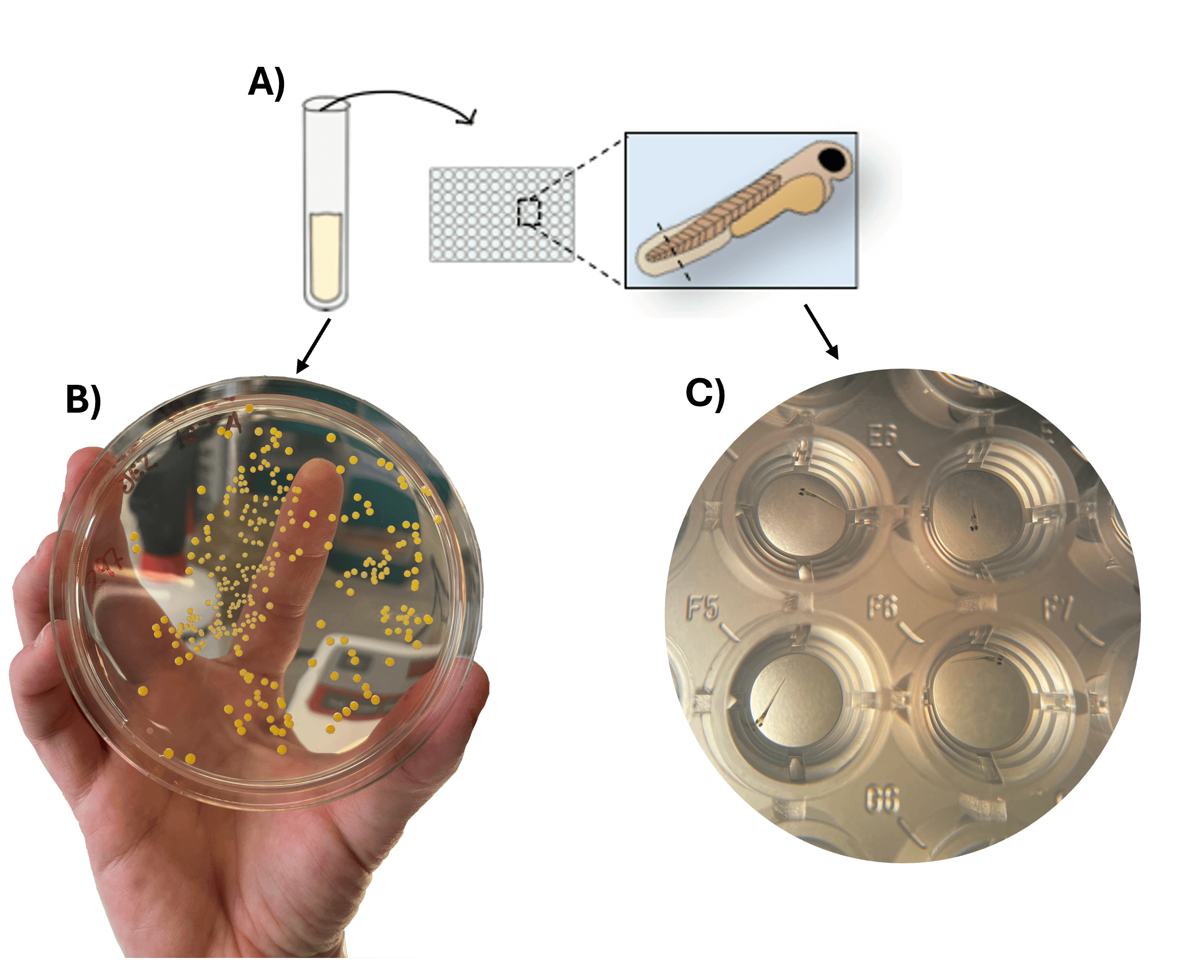 Figur tekst: Tail-cut immersion infection model in zebrafish larvae, showing (A) a schematic overview of the infection method, (B) Staphylococcus aureus grown on agar plates, and (C) larvae housed in a 96-well plate during infection.
